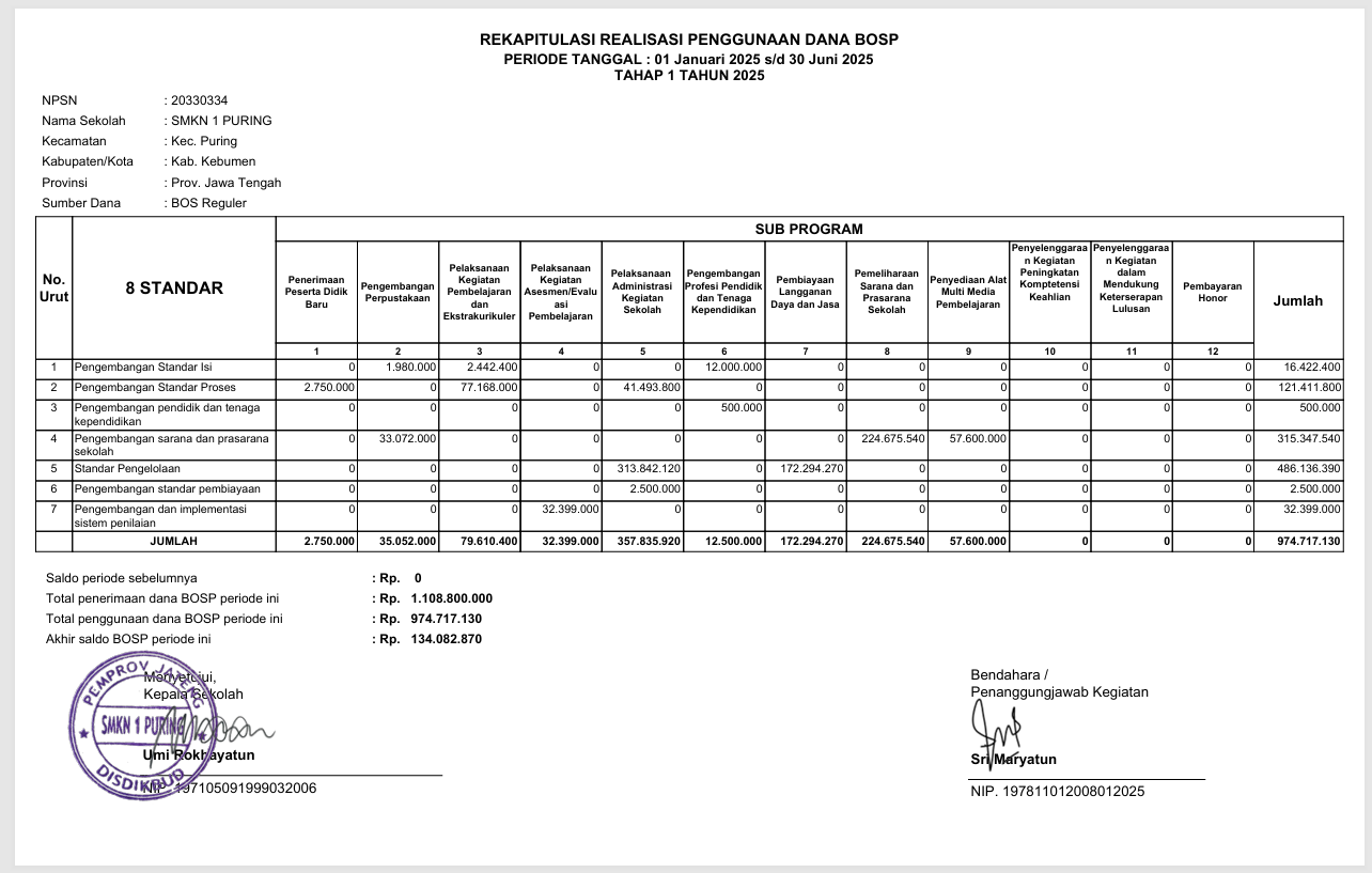 REKAPITULASI REALISASI PENGGUNAAN DANA BOSP TAHAP 1 PER 1 JAN 2025 - 30 JUN 2025 SMKN 1 PURING